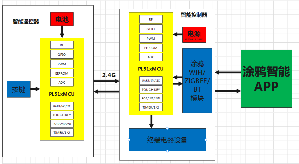 目前市场终端设备产品实现人机互联互通方式多样,功能需求个性化定制越来越多,使用PL51WT003/PL51WT140结合涂鸦WiFi、ZigBee、Bluetooth联网模块,实现设备通过APP与云端通信,同时解决终端设备产品功能需求个性化定制,本地场景离线模式互联互通,自组网控制,解决多产品控制不一致等问题,使得终端设备单品在实现互联互通上具有最佳解决方案。